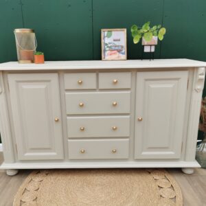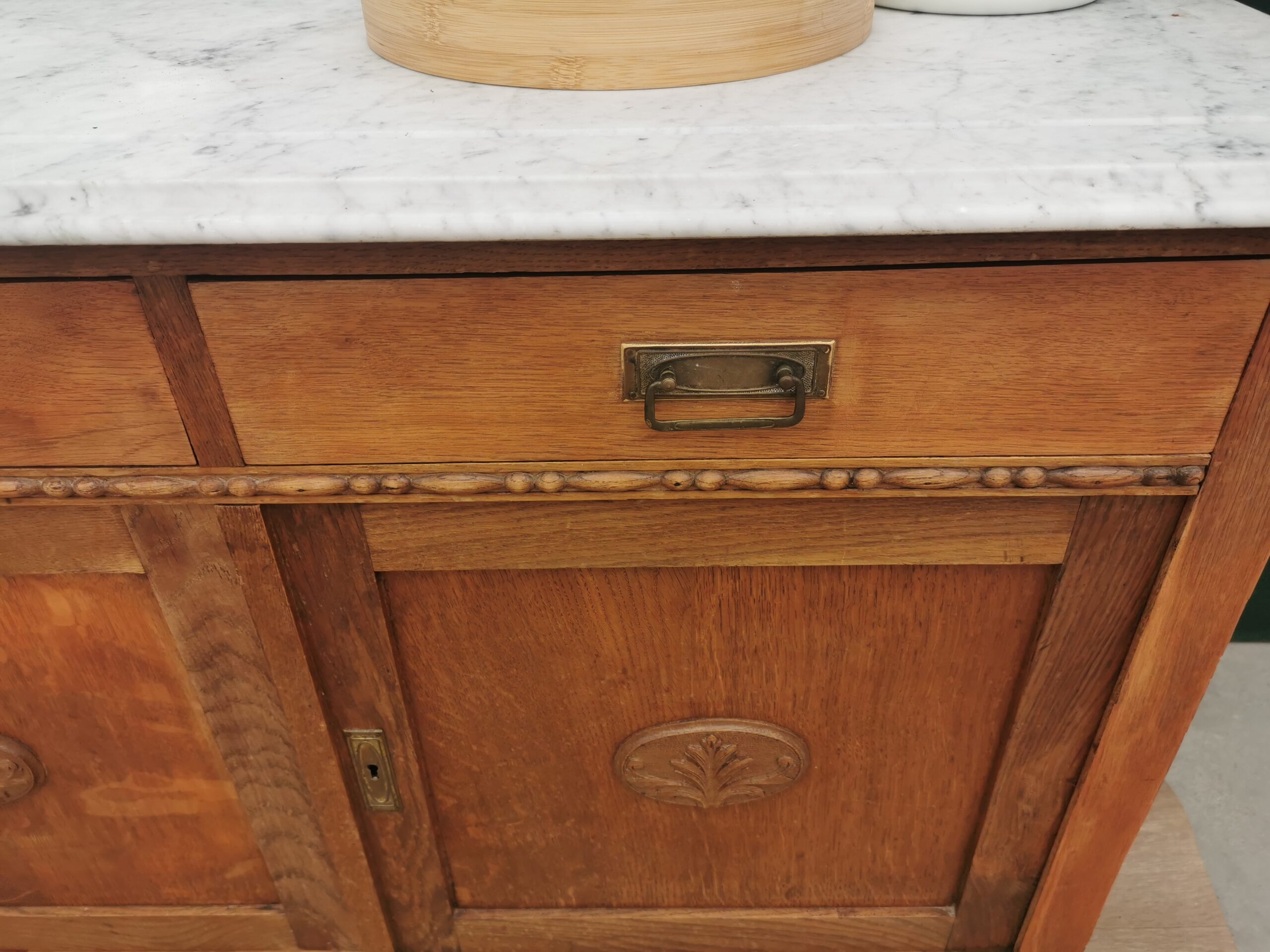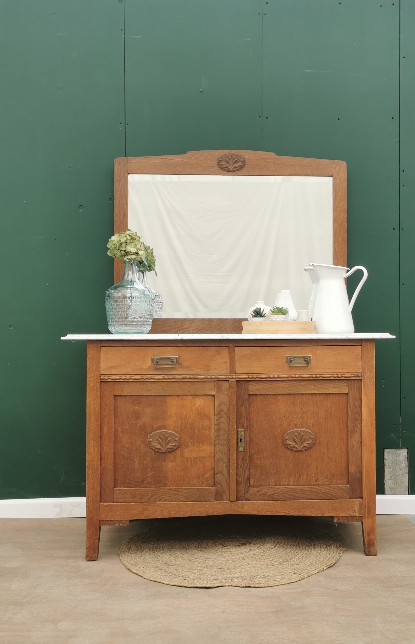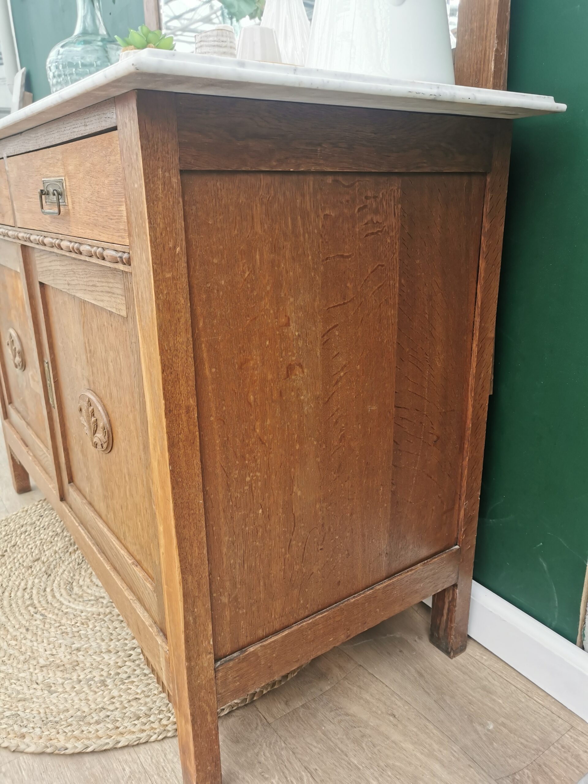 Vintage dressoir / commode eikenhout met marmeren blad en facetgeslepen rechthoekige spiegel.